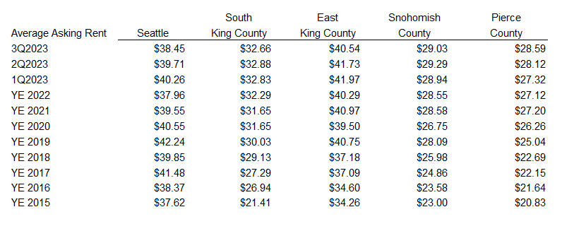 October 5, 2023Eastside office vacancy is 9.54% currently, up 178 bps from 7.76% last quarter and up significantly by 409 bps from 5.45% a year ago.Eastside office inventory currently stands at 58.3M+ s.f.8 major Eastside office projects under construction (excluding the 3M s.f. Microsoft campus expansion) collectively totaling 3.58M+ s.f.; a healthy 71% is pre-committed.One significant office delivery in the 3rd quarter; the Amazon leased Tower 555 project (940K s.f.) developed by Vulcan.Eastside availability increased for the fourth consecutive quarter going from 15.60% last quarter to 16.90% currently, well above the 11.60% mark a year ago.Net Eastside office absorption over the quarter was negative at -179.6+ s.f. This compares to 671.8K+ s.f. last quarter and 379.4K+ s.f. during the 1st quarter 2023. Year-end 2022 net absorption was negative at -87.3K+ s.f.The current amount of available new Eastside office construction to absorb is 1.05M+ s.f., compared to historic annual net absorption of just under 500K+ s.f. historically.Eastside office leasing over the quarter totaled 112 deals containing 415.5K+ s.f. in total volume nominally exceeding last quarter’s total volume (397.1K+ s.f.).Bellevue’s CBD office vacancy increased to 9.5% from 8.4% last quarter. The average CBD rent quote is $50.68/s.f./yr, down 6.5% from $51.01/s.f./yr last quarter.Vacancy rates in key peripheral Eastside office submarkets changed over the quarter to 8.4% and 6.5% for Redmond and Kirkland, compared to 8.1% and 6.8% last quarter, respectively.The average rent quote for the Eastside is currently $40.54/s.f./yr, down $1.19/s.f./yr from $41.73/s.f./yr last quarter, but above $39.49/s.f./yr one year ago.