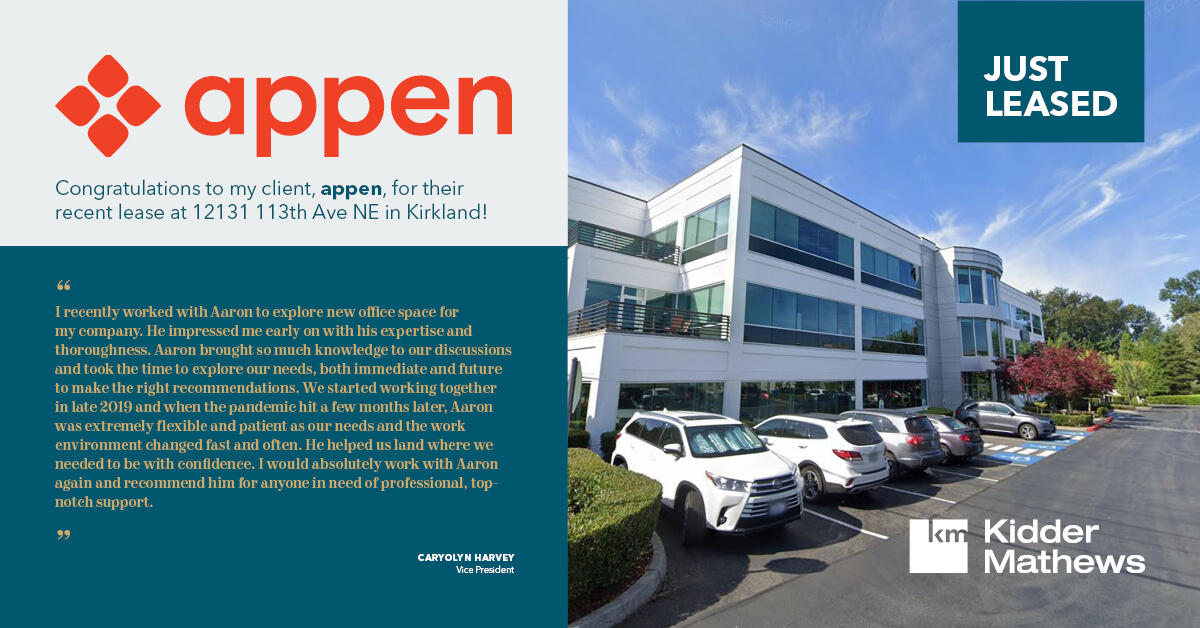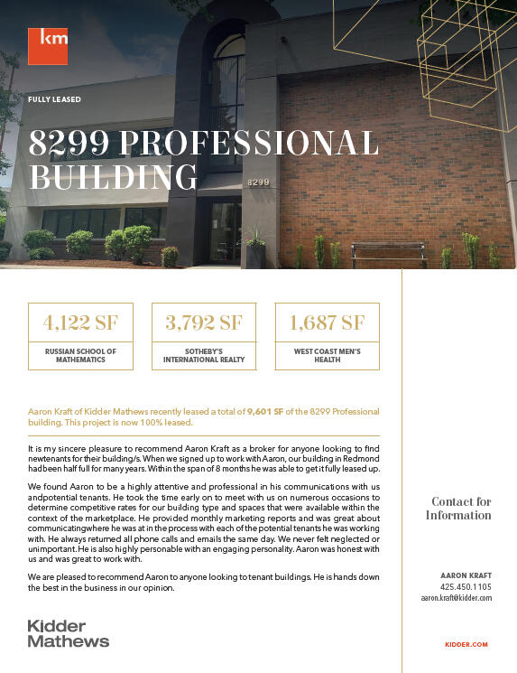 "I worked with Aaron over a period of about one year as we searched for new office space in Redmond, WA. What made our search unique is that our process started just before COVID and as events began to play out we needed to consider macro events and adjust our plan, and schedule accordingly. Aaron was a true professional and led us through the process during this unique time, and ultimately helped us to land an ideal outcome. He was professional, diligent, and responsive throughout. Aaron gets our highest recommendation"Rob Wright