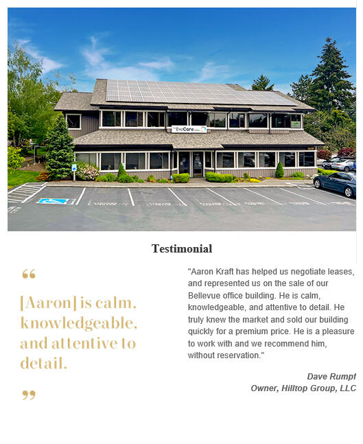 The purpose of this letter is to recognize and recommend the outstanding service, professionalism, and most importantly, the expertise of Aaron Kraft as a commercial real estate professional.We started to work with Mr. Kraft about two years ago regarding the potential sale of our building in downtown Bellevue. Due to our circumstances with our current tenants, we were particularly anxious to list the property on the open market, thinking that they would leave.In our general discussions with Aaron, we determined what sort of buyer we should focus on. From there, he did the all-important legwork in presenting it to several interested buyers eventually finding a match that met our qualifications. Therefore, he was able to help us pair the highest use value with the right buyer without endangering our cash flow.After finding the right buyer, Mr. Kraft also guided us through the closing process, making it as easy as any transaction of this size could be. His willingness to work with us, even at odd hours, with inspectors, architects, and the future owners, to minimize any distraction to our operations was tantamount to maximizing value for us.Aaron has earned my highest recommendation as a Real Estate Broker, and as a result, I would highly recommend him to those working on commercial real estate in the King County area.Very truly yours,Michael J. Zuccarini